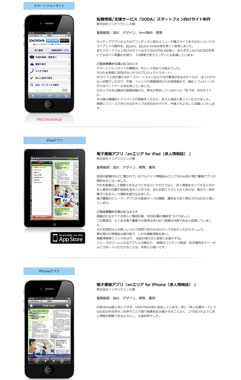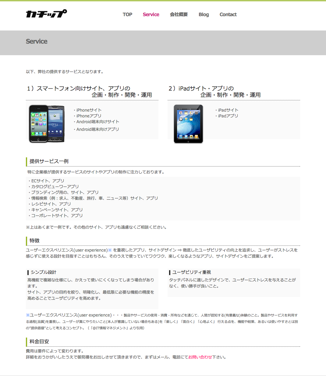 iPhone、iPadアプリ、スマホサイト企画制作をする株式会社カチップのコーポレイトサイト 創業時からのお付き合いで、ロゴからサイトまで制作し、その後「DODA」「an」などの大手クライアントからの仕事の受注を増やすことに成功したWebサイト